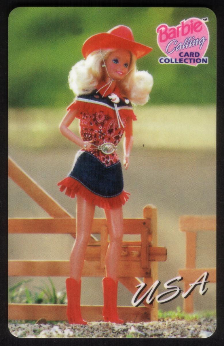 This collectible phone card features the Barbie doll dressed as a USA Cowgirl. Barbie is styled with blonde curly hair and wears a red cowboy hat, a red and white bandana tie around her neck, and a red patterned top with black and red fringe details. She sports a denim skirt with red fringe at the hem and a large western-style belt buckle. Her footwear consists of red cowboy boots, complementing her western-themed outfit.