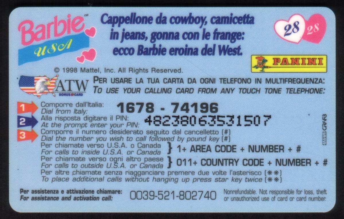 This card was issued in 1998 by Mattel Inc. and is designed for use in Italy. It showcases a distinctive Barbie character from the USA Cowgirl (USA) Native Dress series, numbered 28 out of 28 in the collection. The card is a collectible item associated with the AmeriVox and ATW networks.