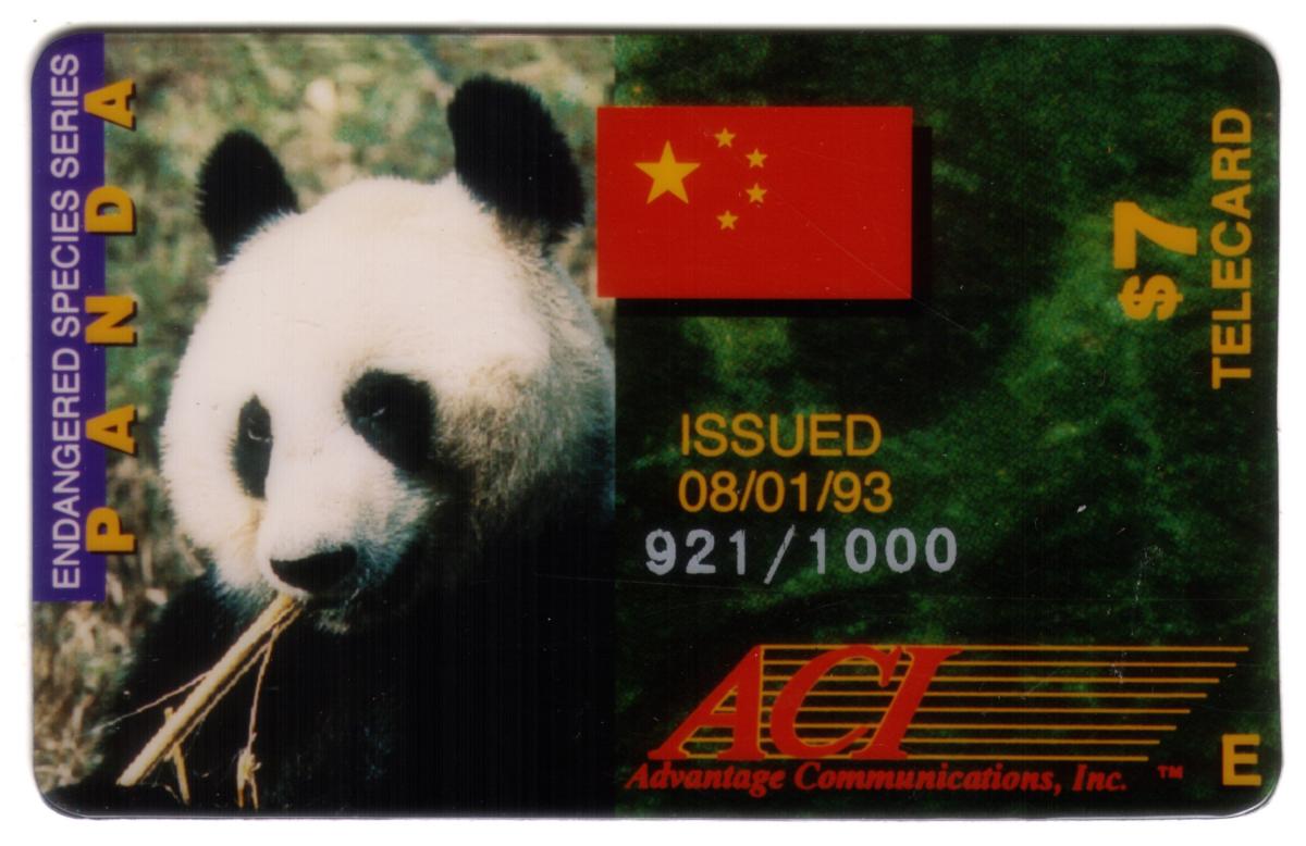 Endangered Species Series featuring a panda in bamboo, highlighting wildlife conservation; limited edition, $7 value, issued in 1993 by Advantage Communications.