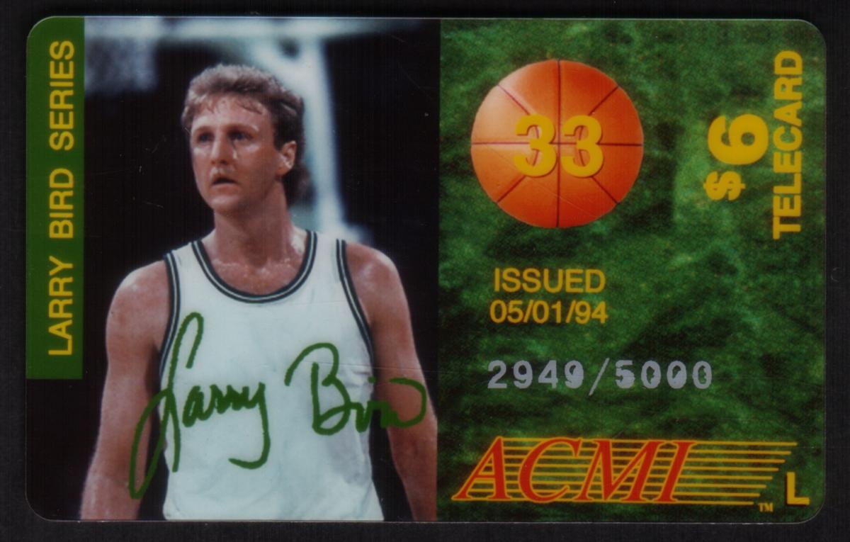 Larry Bird basketball phone card featuring his image in Celtics jersey, orange basketball graphic, serial number, and limited edition details from 1994.