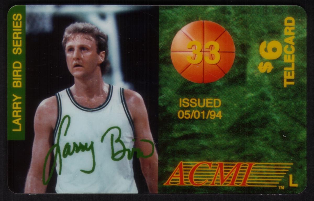 This telecard is part of a series celebrating Larry Bird and the Boston Celtics, issued under the ACMI brand on May 1, 1994. It represents the sport of basketball specifically within the NBA, showcasing one of the league’s most valuable and iconic players.