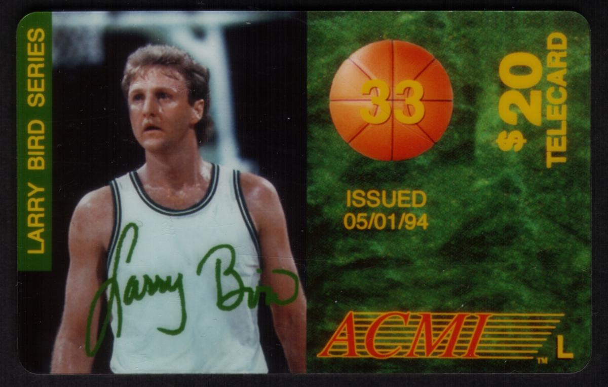 At the bottom right corner, the ACMI logo is present in red and orange with yellow accents, accompanied by a capital letter "L." This telecard is valued at $20 and was officially issued on May 1, 1994. It is part of a Larry Bird series, emphasizing his status as a prominent NBA Most Valuable Player (MVP).