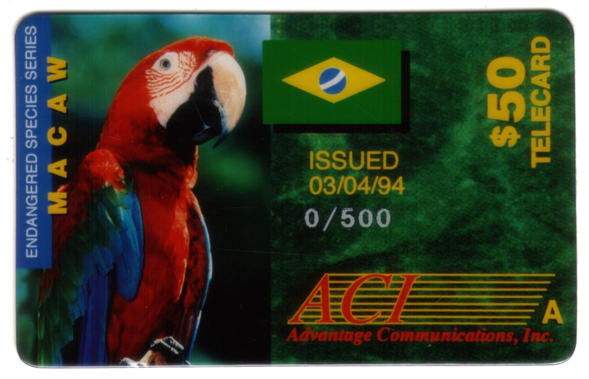 The card is part of the "Endangered Species Series" as noted on the left border with the words "ENDANGERED SPECIES SERIES" in vertical blue text. The name "MACAW" is also written vertically in yellow along the left edge. At the bottom right, the card features the logo "ACI" with the text "Advantage Communications, Inc." in red, accompanied by a small letter "A" on the right of the logo. This telecard is specifically designed to highlight the endangered status of the macaw bird species.