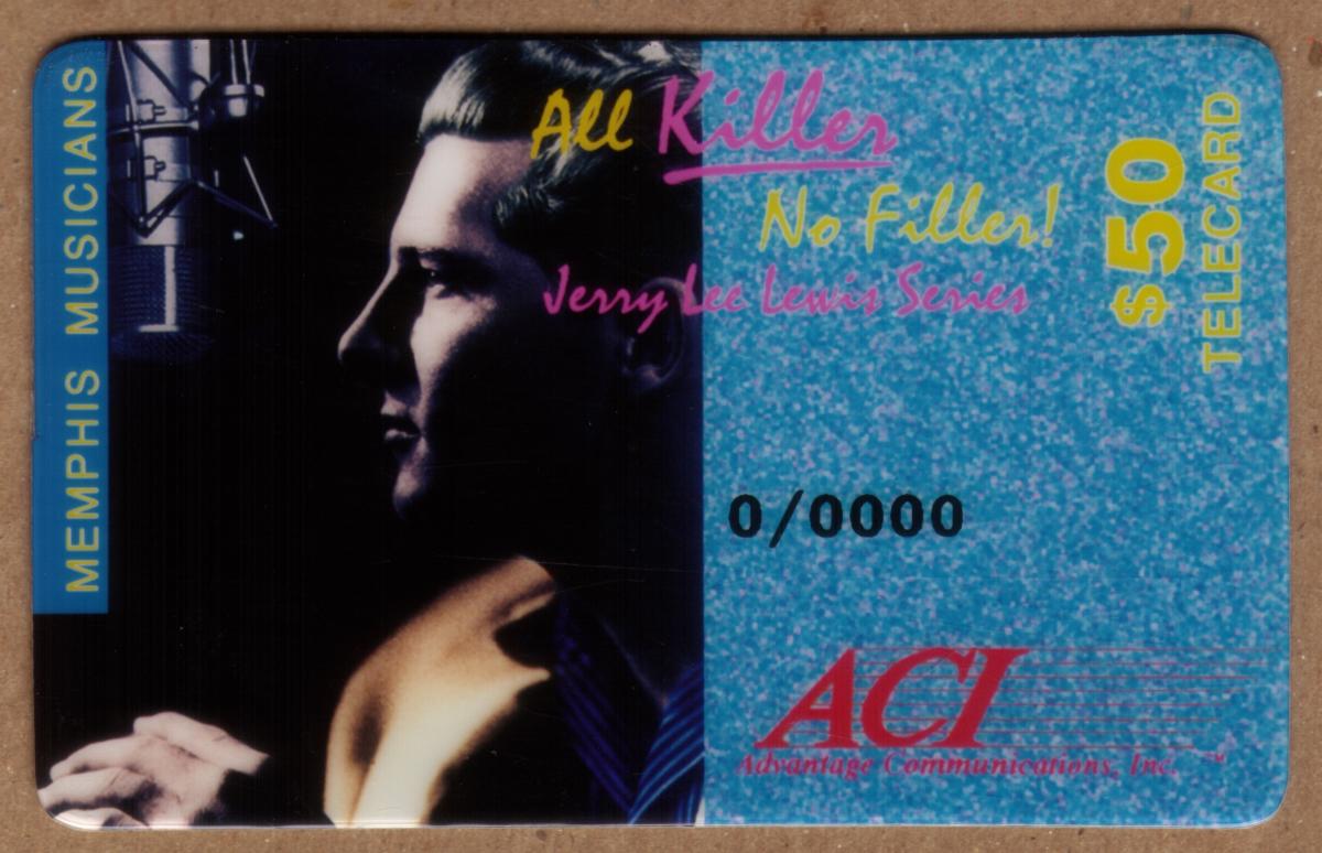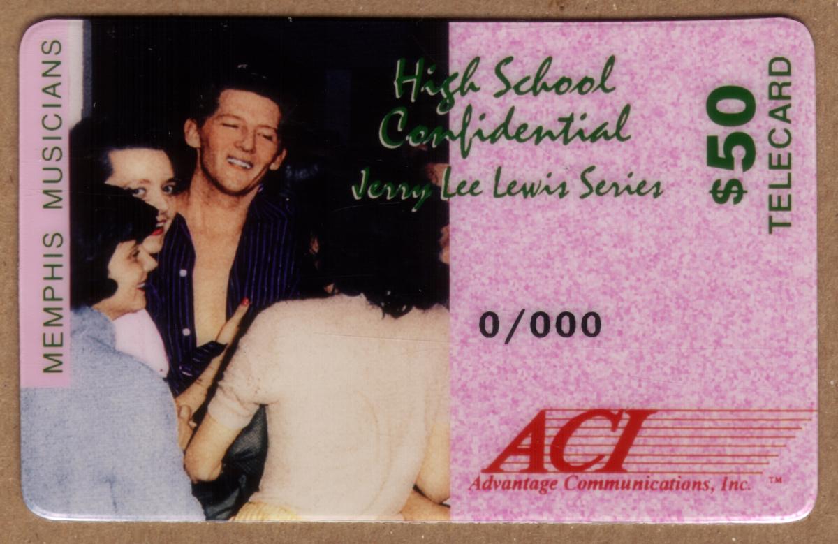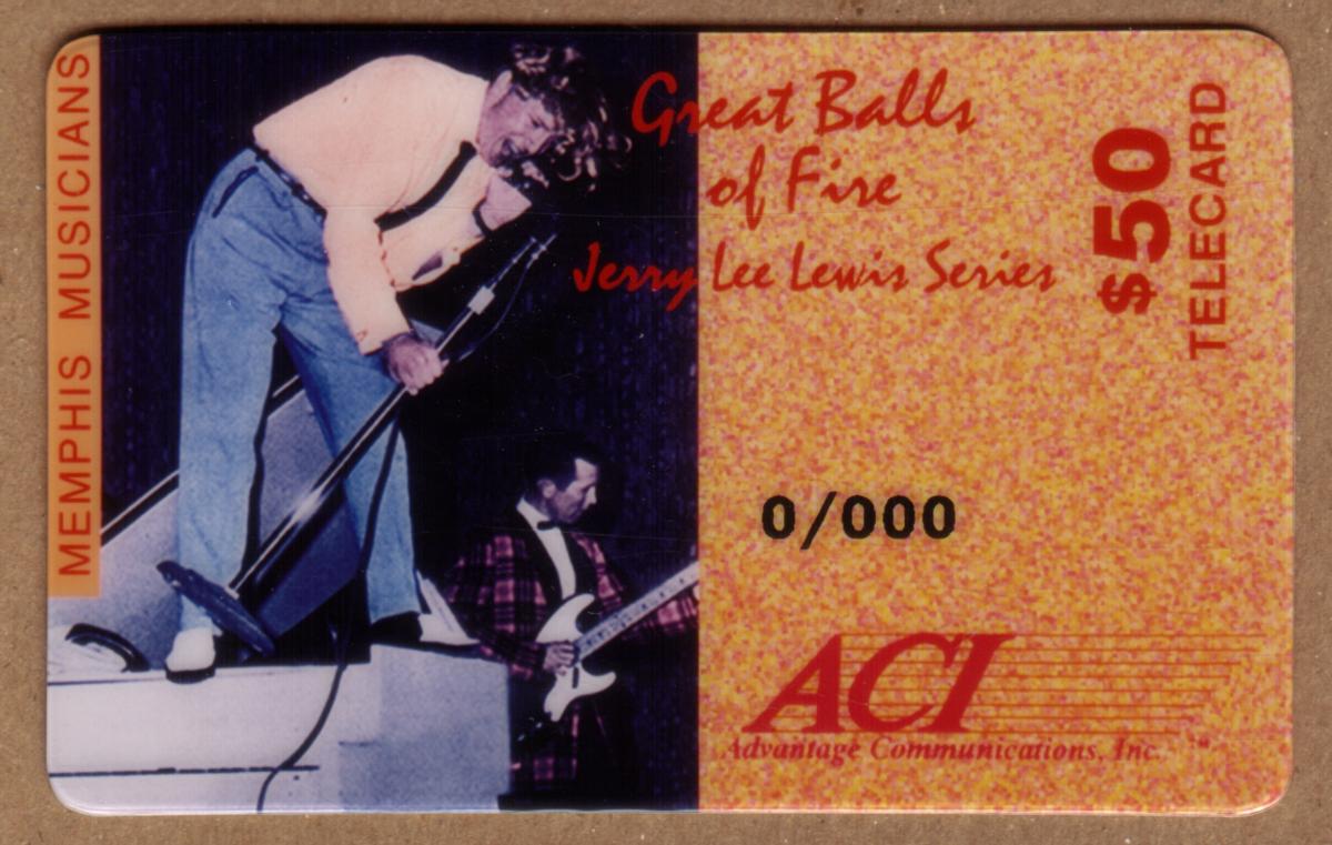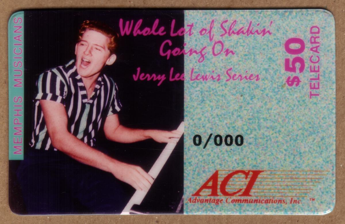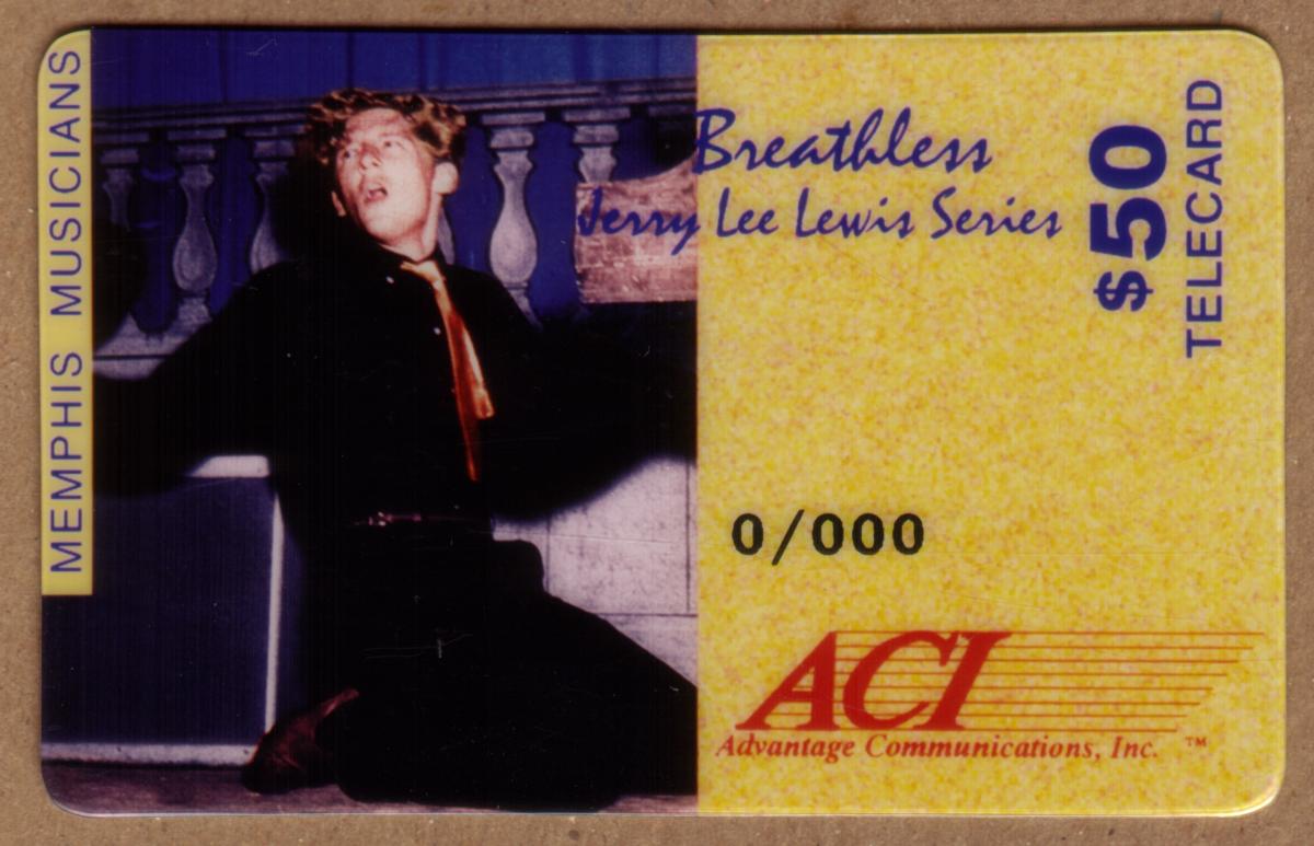 This collectible phone card features Jerry Lee Lewis, a legendary figure in 1950s rock and roll music. The design highlights iconic references to his career, including song titles such as "Whole Lot of Shakin' Going On," "Breathless," "Great Balls of Fire," and "High School Confidential." These songs are prominently associated with Lewis’s energetic style and contributions to the genre. The card emphasizes his role as a Memphis musician and captures the spirit of Americana and entertainment from that era.