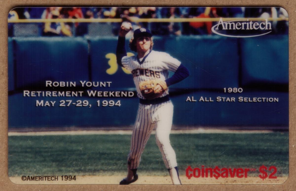 This card honors Robin Yount's legacy as a notable baseball player, emphasizing his All Star selection in 1980 and his retirement celebrations in 1994 within the context of Wisconsin baseball. It combines both a collectible tribute and a functional coin saver prepaid calling card.