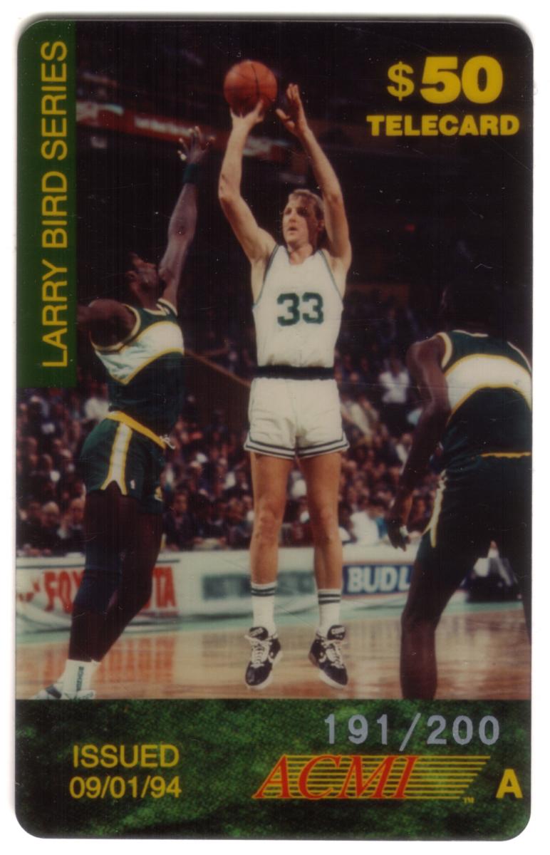 The card is part of a limited edition, numbered 191 out of 200, and is issued by ACMI. It holds a face value of $50 as indicated in the top right corner with the text "$50 TELECARD." The issuance date is printed at the bottom left as "09/01/94." The design includes a green vertical stripe on the left with the text "LARRY BIRD SERIES" and an "A" marking positioned near the ACMI logo at the bottom. The overall presentation highlights the significance of Larry Bird as an NBA MVP and basketball icon in NBA history.