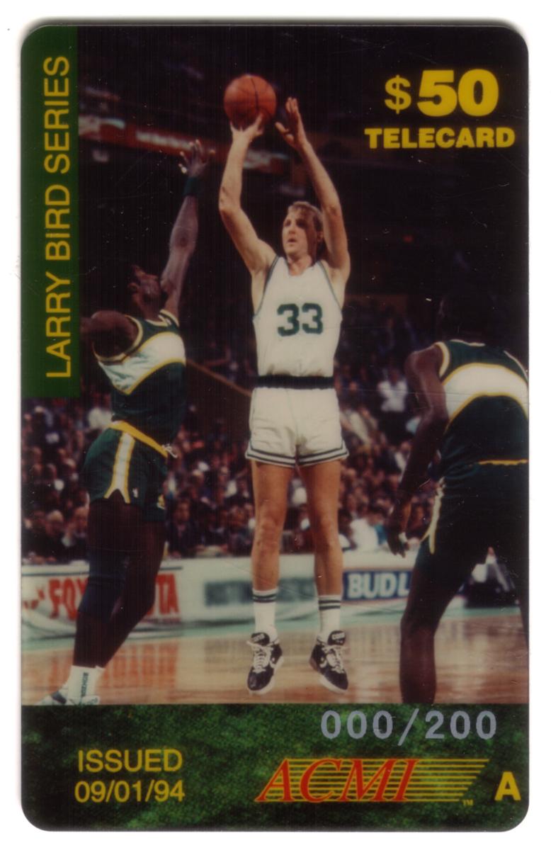 This collectible telecard features a basketball game scene showcasing Larry Bird of the Boston Celtics, wearing jersey number 33, mid-jump shot with the basketball raised above his head and focused on the basket. Two opposing players, dressed in dark green and yellow uniforms, are defending against Bird's shot. The card is part of the "Larry Bird Series" by ACMI and holds a value of $50 as indicated in the top right corner. The card is labeled as "Issue A" and is marked as a specimen with the numbering "000/200" printed at the lower right.