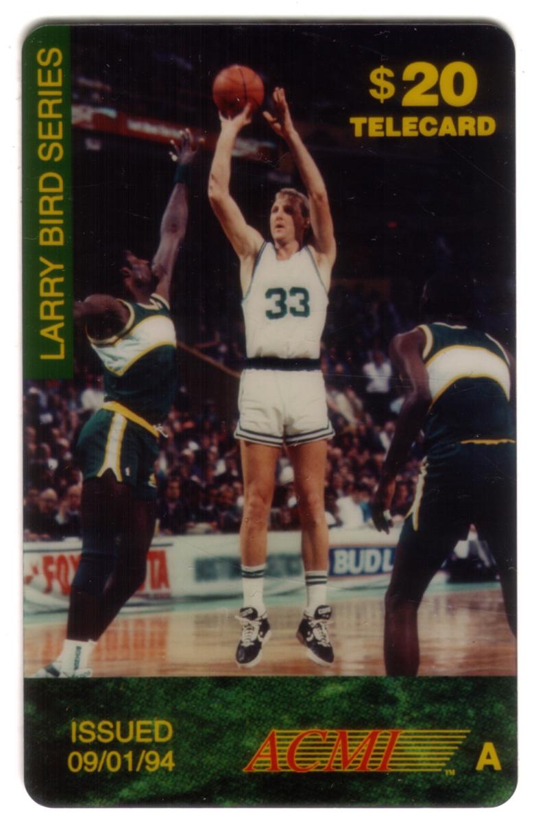 This collectible phone card features Larry Bird, wearing his Boston Celtics basketball uniform with the number 33, in the act of shooting a basketball during a game. Two opposing players in green and yellow uniforms are positioned on either side of him. The card is part of the Larry Bird Series issued by ACMI, marked "Issue 'A'." The card has the denomination of $20 and is clearly labeled as a TELECARD.