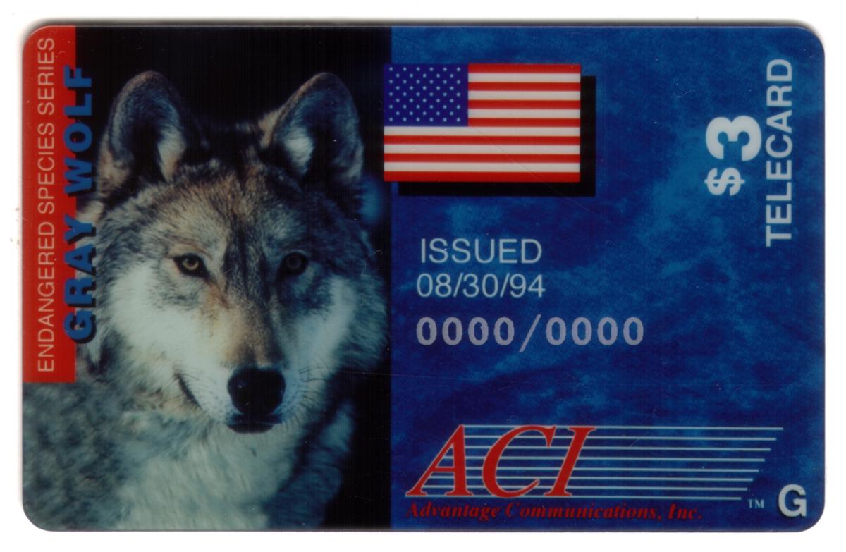 This collectible $3 telecard features a detailed photographic image of a gray wolf, showcasing the animal's face and upper body against a blue gradient background. The left side of the card contains a vertical red banner with white text reading "ENDANGERED SPECIES SERIES," followed by large vertical text in black stating "GRAY WOLF." On the right side, a small American flag is displayed near the top center with the text "ISSUED 08/30/94" below it.