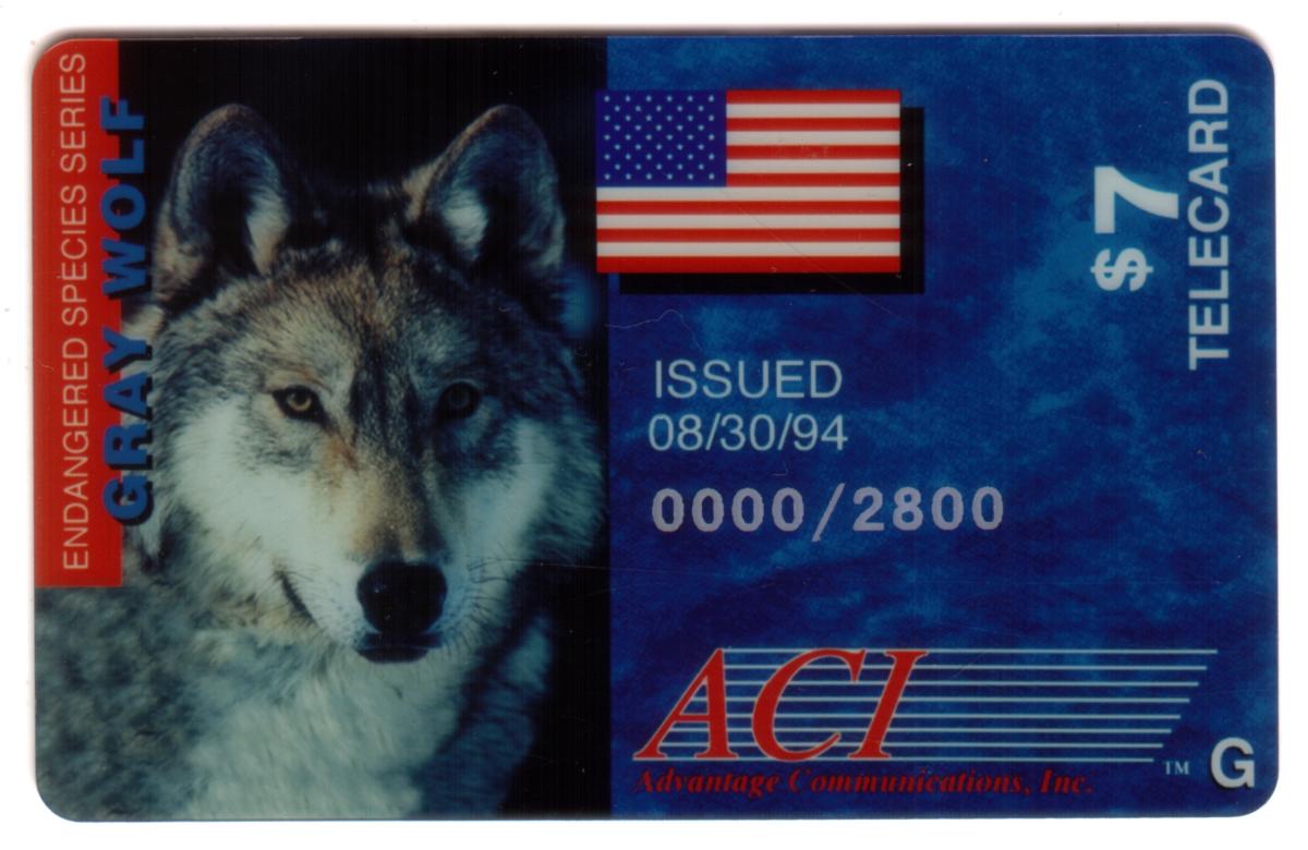 This collectible telecard features a detailed photographic image of a gray wolf on the left side, showing the animal’s face with clear, focused eyes and fur in shades of gray and white. To the right of the wolf image, there is an American flag prominently displayed near the top center on a dark blue marbled background.