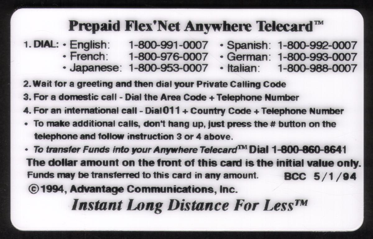 This Advantage Communications corporate telecard was designed for making long-distance calls at a reduced rate and carries a distinctive red and gold design emphasizing the company’s branding and promotional messaging.