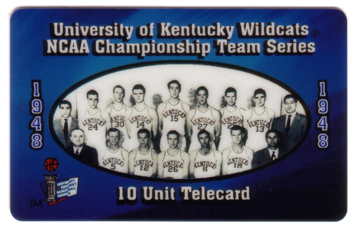 This collectible phone card features the University of Kentucky Wildcats men's basketball team from the 1948 NCAA Championship Team Series. The card presents a black and white team photograph of the players and coaches arranged in two rows, each wearing vintage University of Kentucky basketball uniforms with "Kentucky" printed across the chest and distinct jersey numbers.