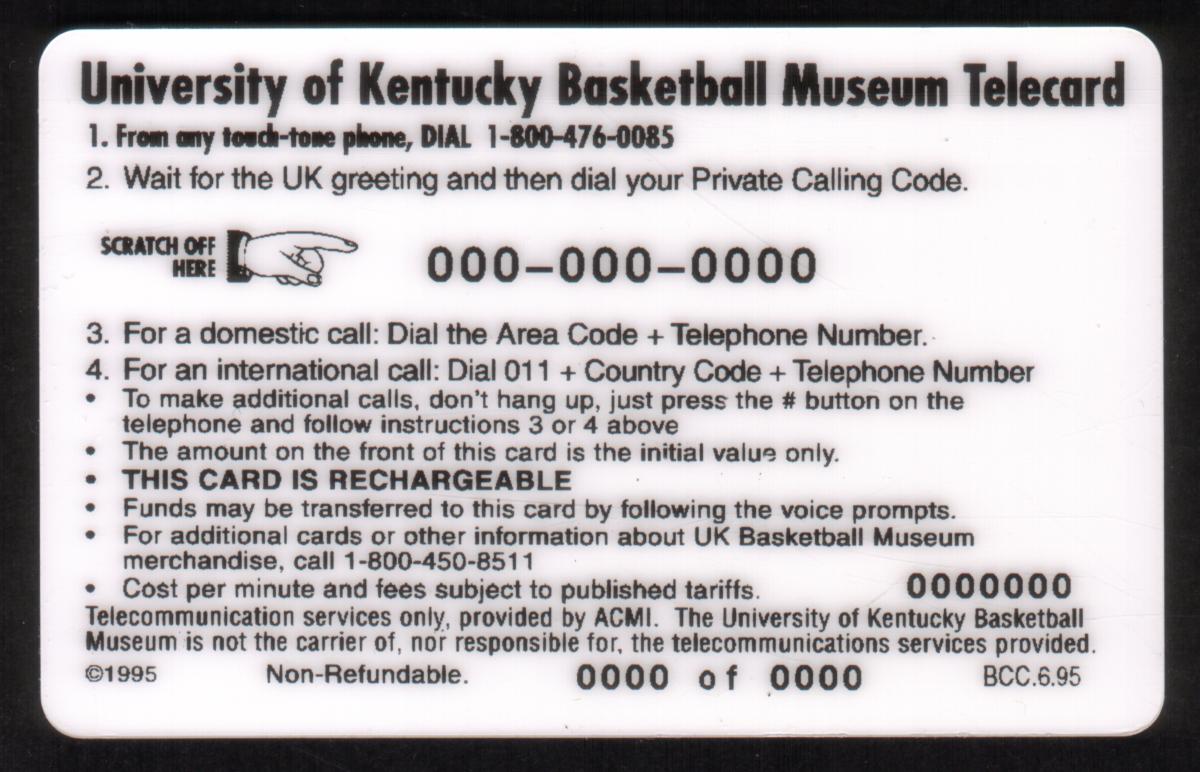 This card honors the 1948 University of Kentucky Wildcats basketball team under Coach Adolph Rupp, recognized for their NCAA championship victory. The legend and team photo celebrate Kentucky’s basketball history in a collectible telecard format.