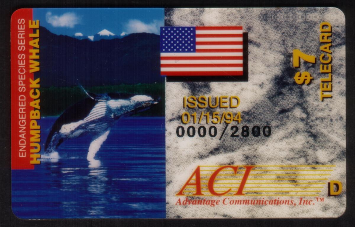At the bottom right, the logo and name of the issuer "ACMI" and "Advantage Communications, Inc." are presented in red and gold text. A capital letter "D" is located near the issuer's name. This telecard is part of the Endangered Species Series highlighting the humpback whale and includes the USA flag emblem.