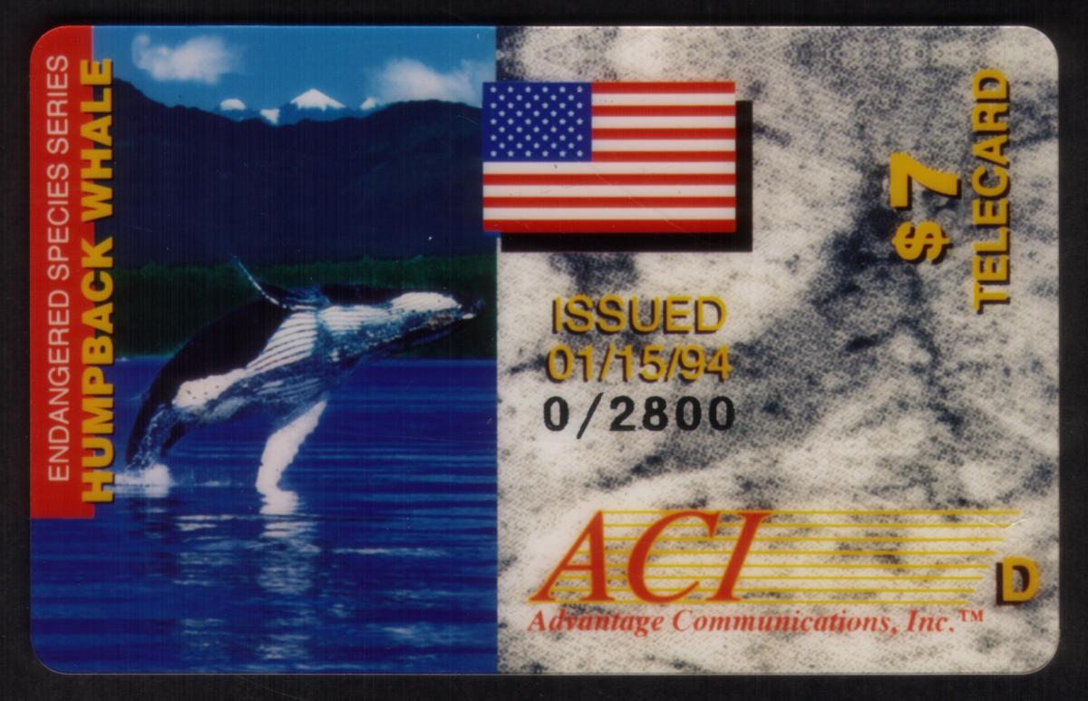 This phone card commemorates the humpback whale as part of the Endangered Species Series, linking wildlife conservation awareness with collectible telecommunications memorabilia. The limited edition number "0/2800" suggests a restricted issuance, enhancing its collectible value.