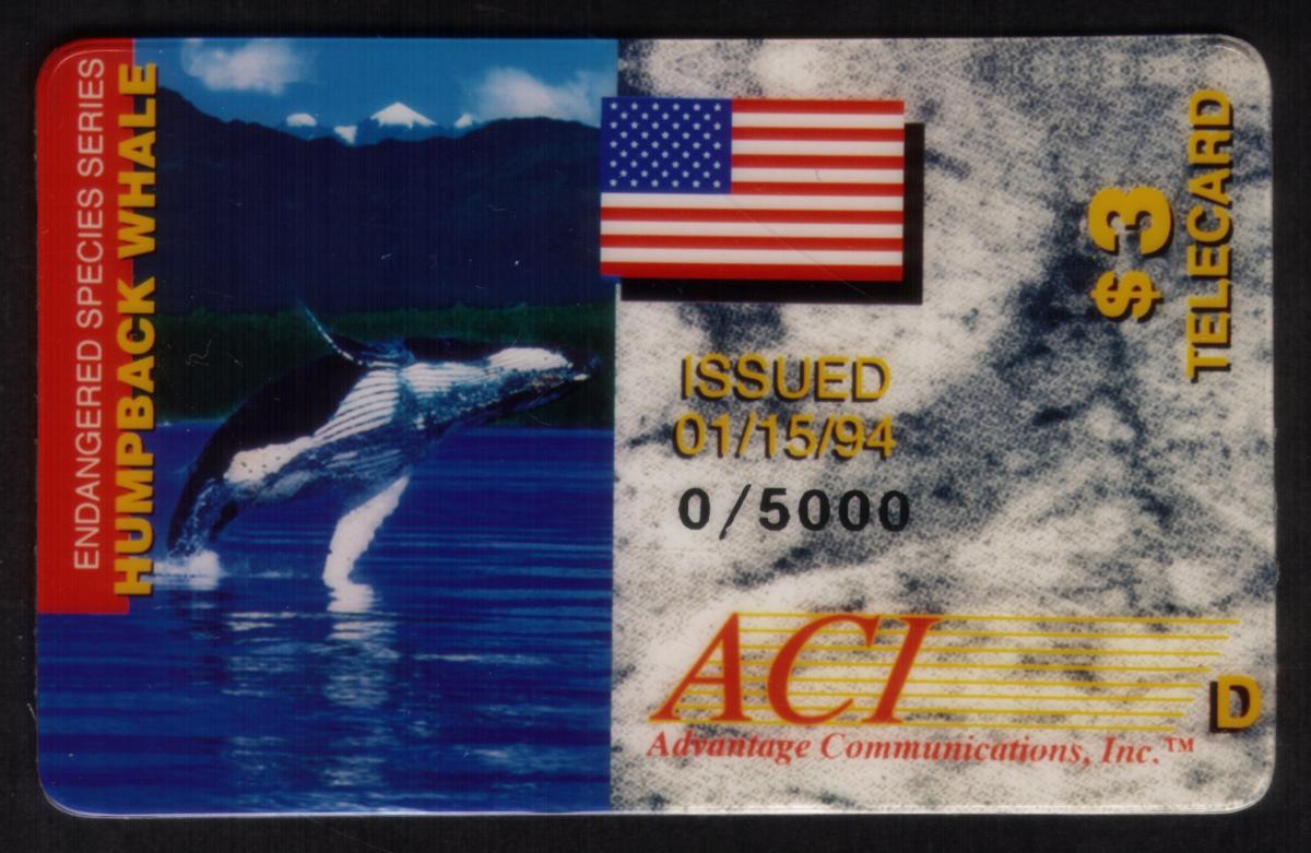 This telecard honors the humpback whale as an endangered species and is part of a limited edition series issued in January 1994. The design includes wildlife imagery and patriotic elements represented by the American flag. The card’s visual elements and text make it a collectible item focused on sea life preservation and communication services.