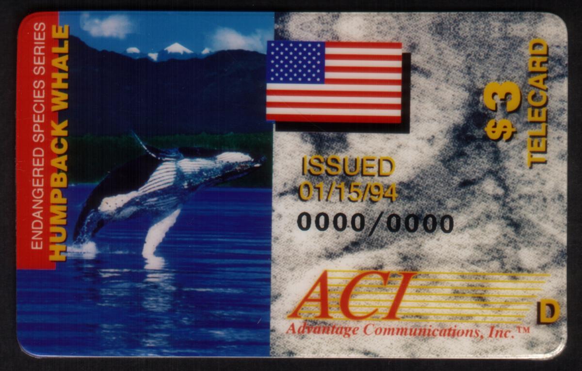 Endangered species phone card featuring a humpback whale, U.S. flag, and Advantage Communications logo, promoting conservation and telecom use.