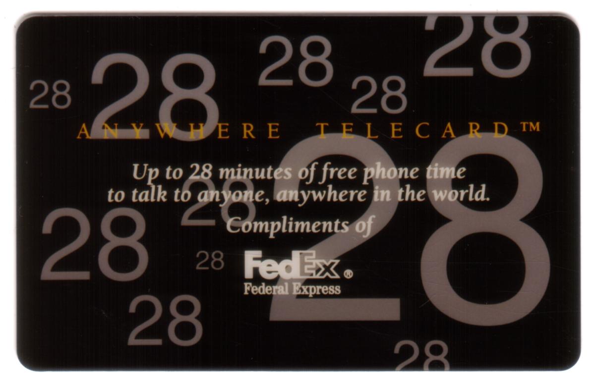 The card provides up to 28 minutes of complimentary telephone usage and is branded with the FedEx name and logo. It has a modern and minimalistic design emphasizing the number 28, which denotes the minutes of phone time available. The card is part of a promotional series associated with Federal Express.