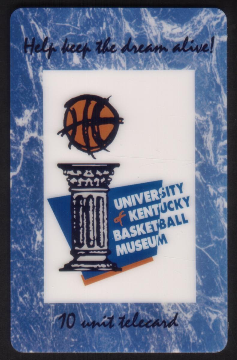 This collectible phone card features a basketball design associated with the University of Kentucky Basketball Museum. The central image consists of a basketball resting atop a classical column, symbolizing strength and tradition. Behind the column is a blue geometric shape, with white and orange accents, alongside text that reads "University of Kentucky Basketball Museum."