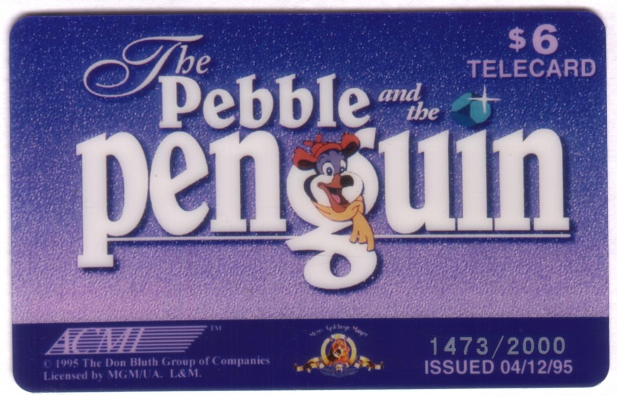 Limited edition 1995 Antarctic-themed phone card featuring The Pebble and the Penguin with playful penguin character, $6 value, official MGM licensing. |