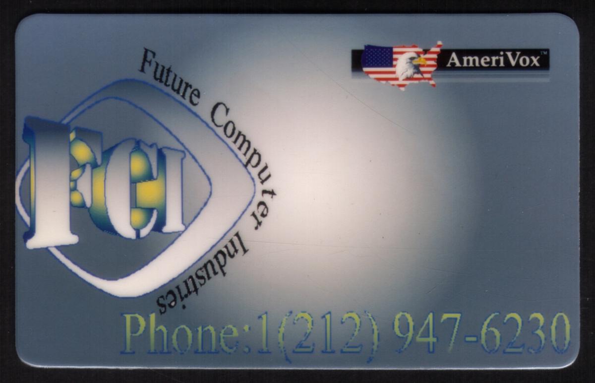 This collectible promotional phone card features branding for Future Computer Industries (FCI), based in New York. The card displays the FCI logo prominently on the left side, consisting of the letters "fci" stylized with a blue, yellow, and white color scheme inside a diamond-shaped outline. Curved around the diamond are the words "Future Computer Industries" in black text.