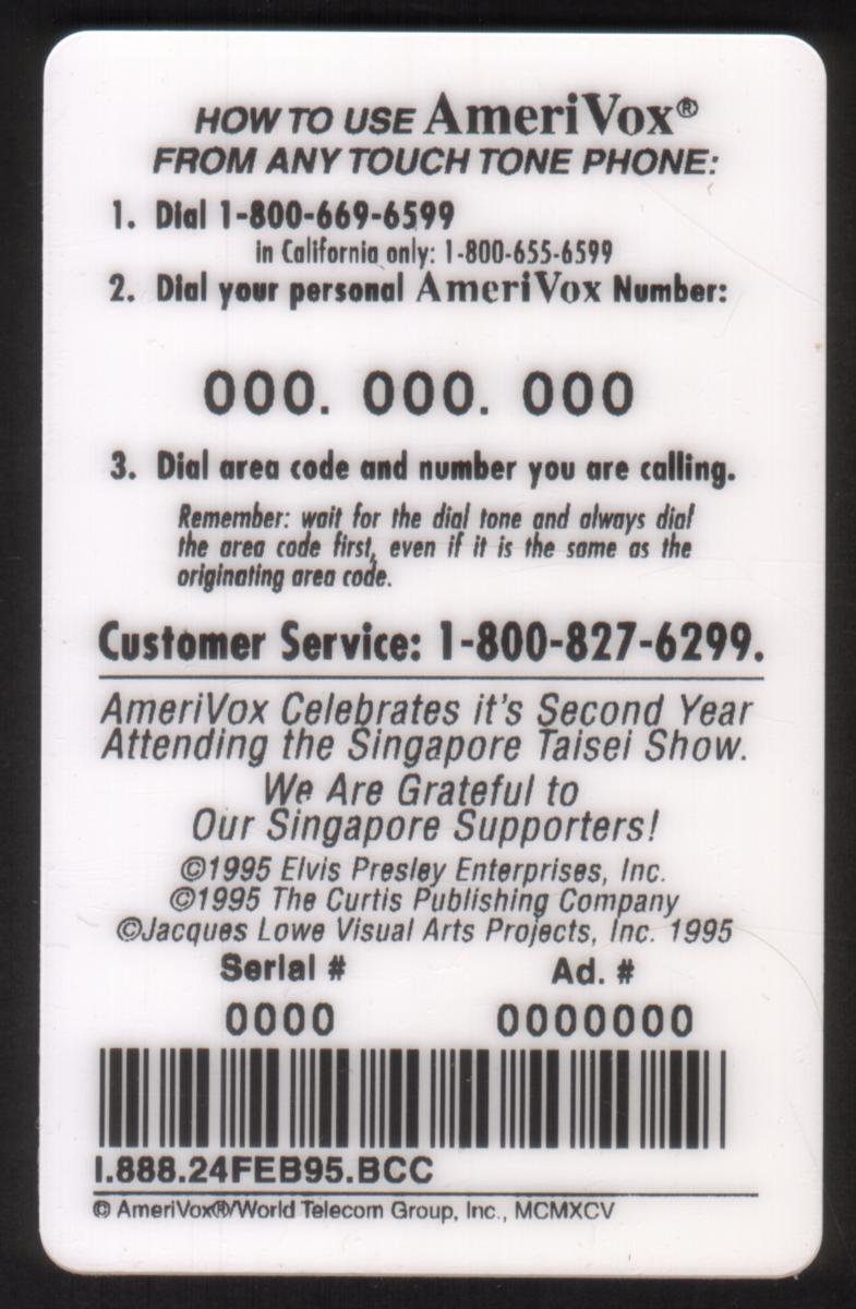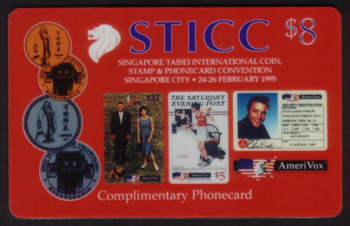 Keywords: Show Cards, numismatics, money, currencies, currency, coin collecting, singapore city, elvis, jackie kennedy, john kennedy, john & jackie kennedy, norman rockwell, singapore taisei international coin stamp & phone card convention, lion, AmeriVox