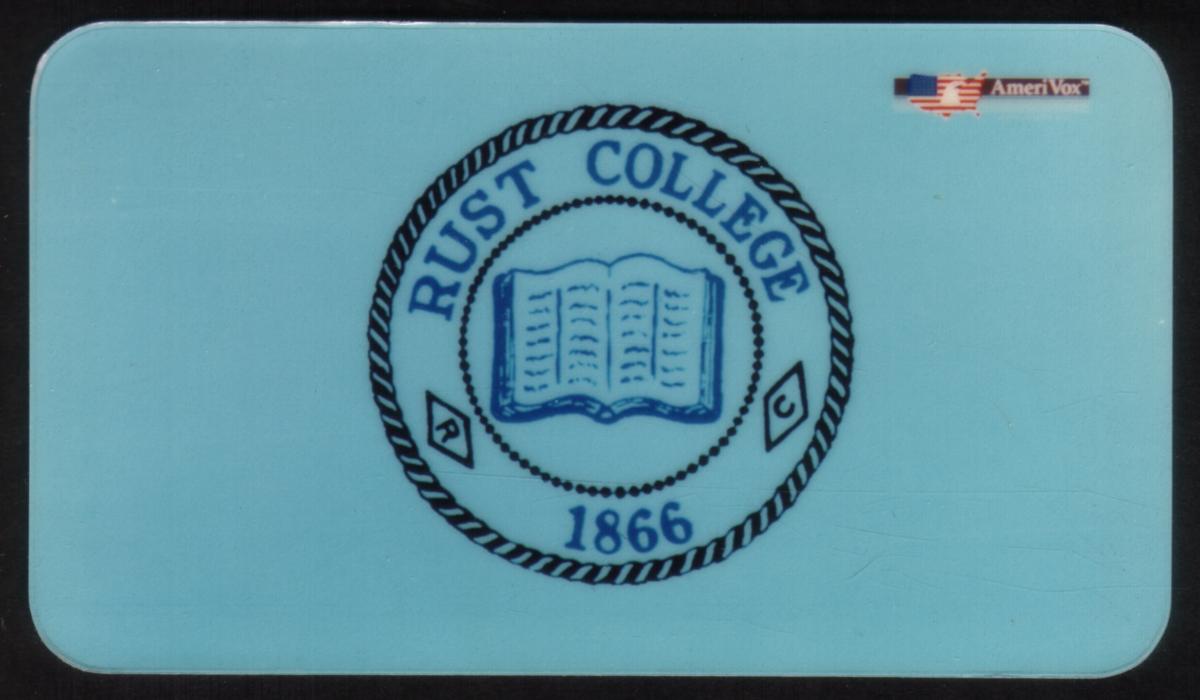 This collectible phone card features the official logo of Rust College, established in 1866. The logo is centered on a light blue background and consists of a detailed image of an open book outlined in dark blue. Surrounding the book is a circular rope design, with the words "RUST COLLEGE" written in blue across the top half of the circle. Flanking the book on either side are the Greek letters Delta and Gamma ("Δ" and "Γ") in black. Beneath the book, the year “1866” is prominently displayed in blue, marking the founding year of the historically black liberal arts college located in Holly Springs, Mississippi.