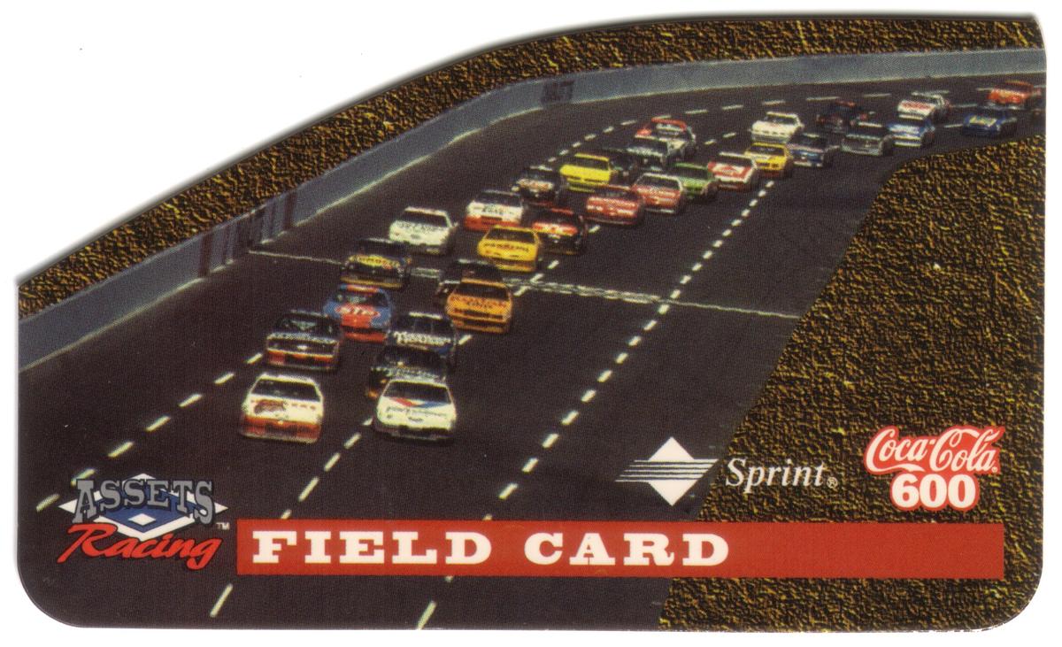 The card prominently displays the logos and text relevant to the event at the bottom left and right corners. "ASSETS Racing" is in a metallic-style font with the word "Racing" in red script beneath it. Adjacent to this is a red banner with the words "FIELD CARD" in bold white uppercase letters. On the bottom right are the Sprint logo, consisting of a white stylized wing symbol, and the “Coca-Cola 600” logo in its classic red and white design.
