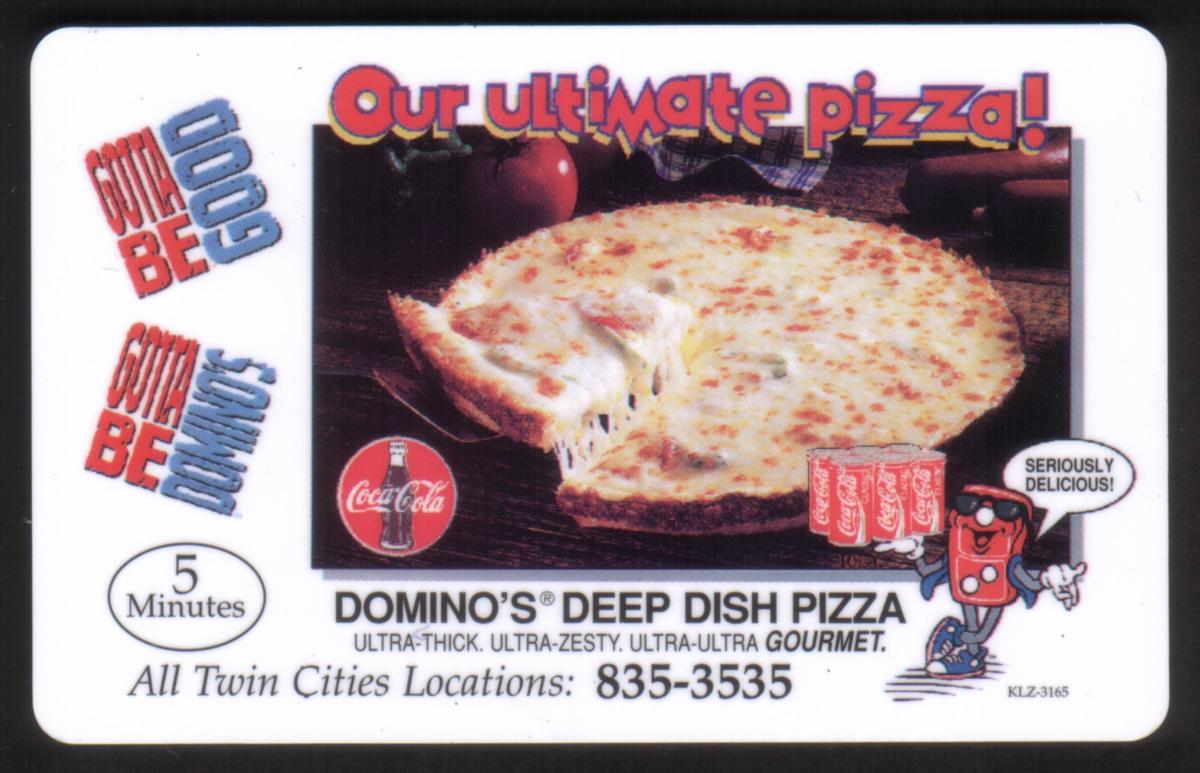 Keywords: Coca Cola, cocacola, food, restaurants, dominos, gotta be good, our ultimate pizza, domino's deep dish pizza, coke cans, ultra-thick, ultra-zesty, ultra-ultra gourmet, all twin cities locations, always coca-cola, gotta be domino's, 6-pack, Ascot, Inc.