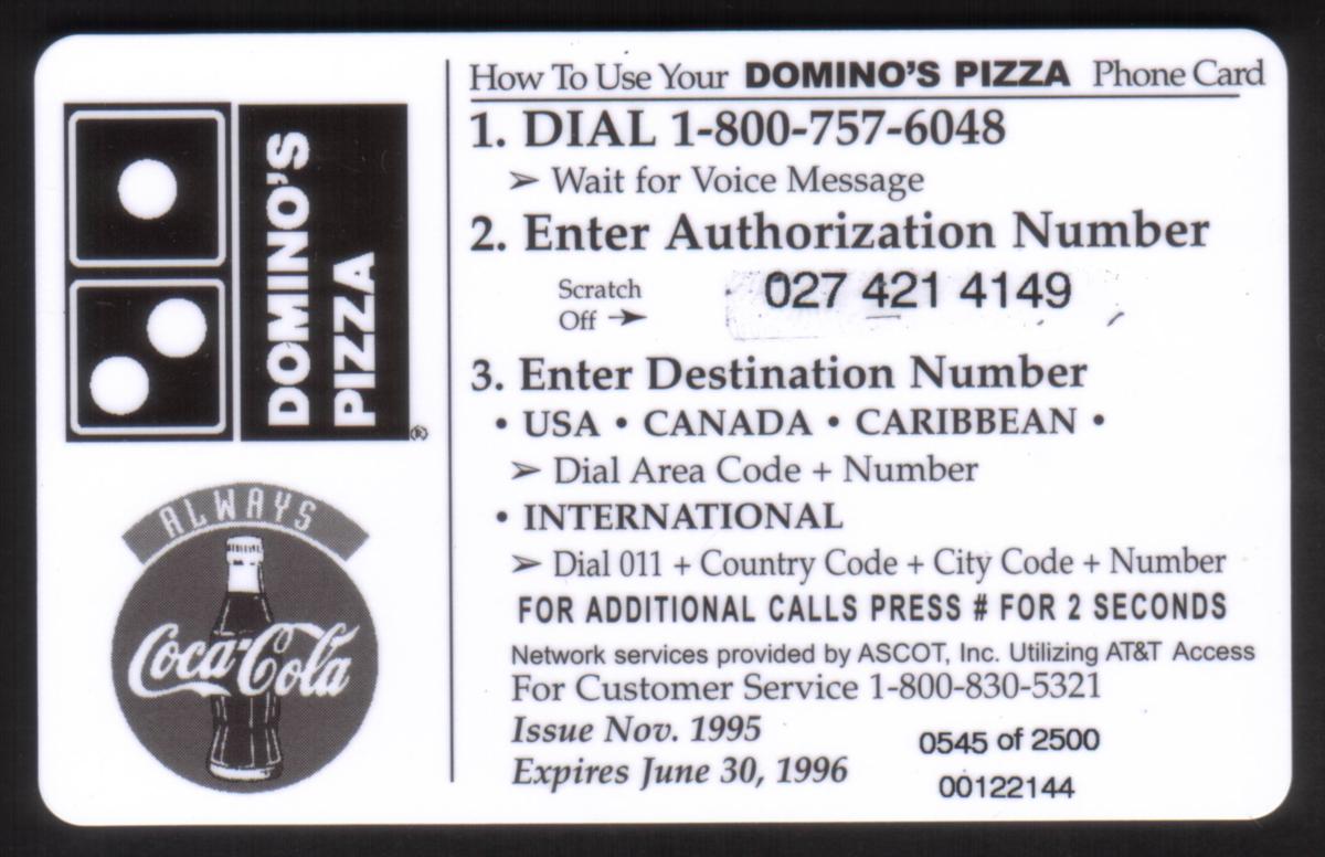Collectible phone card featuring Domino’s Deep Dish Pizza with bold slogans, local contact info, Coca-Cola branding, and playful cartoon soda can. |