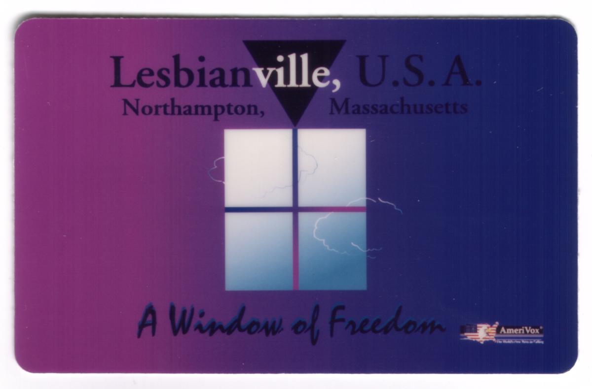 The card’s design includes bold text elements that prominently state "Lesbianville USA" and "Window of Freedom," reinforcing its focus on lesbian pride and visibility. The text "AmeriVox" marks the producer or issuing entity of the card. The overall visual theme and wording emphasize social freedom and acceptance within the context of Northampton, Massachusetts, a city widely recognized for its significance in LGBT history and culture.