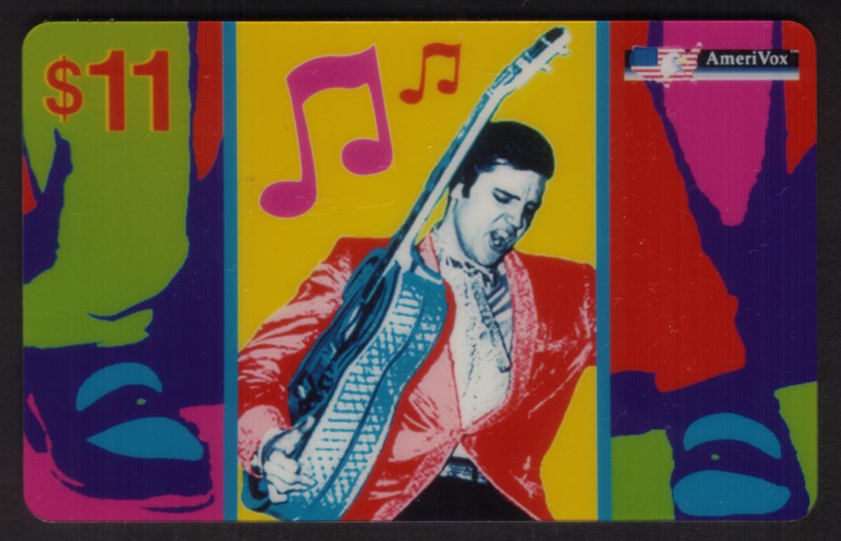 The card has a value of $11, shown prominently in green and red text in the top left corner. The brand AmeriVox is displayed in the top right corner with a small American flag icon incorporated into the logo. Text surrounding the card includes keywords such as "Elvis2," "King of Rock and Roll," "Graceland," and "Blue Suede Shoes," highlighting Elvis Presley’s iconic status in music and entertainment history. The style and imagery celebrate Elvis as a legendary singer, musician, and actor within American pop culture.