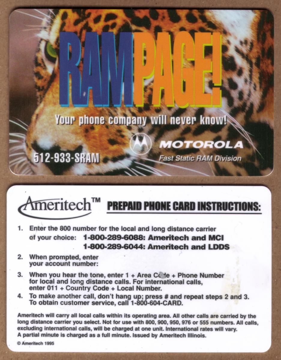 Overall, this is a collectible phone card aimed at promoting Motorola and Ameritech services, combining an eye-catching animal motif with clear text identifying the companies and product features associated with the card. The wording positions the item as a unique promotional specimen within the telecommunications industry.