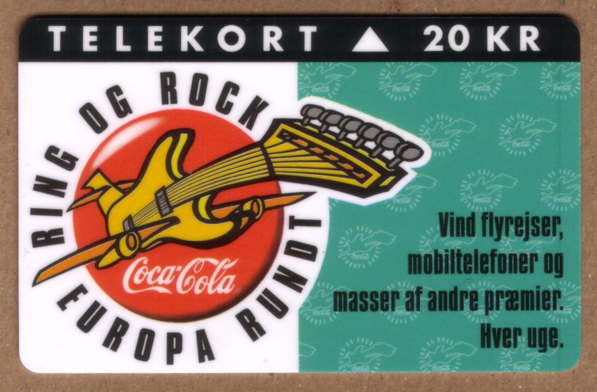 This collectible phone card from Denmark features a vibrant design promoting the "Ring Og Rock Europa Rundt" campaign by Coca-Cola. The central image consists of an electric guitar with yellow and orange tones placed over a bright red circular background that prominently displays the Coca-Cola logo in white script. Surrounding the circle, the text "RING OG ROCK EUROPA RUNDT" curves along the left and bottom edges.