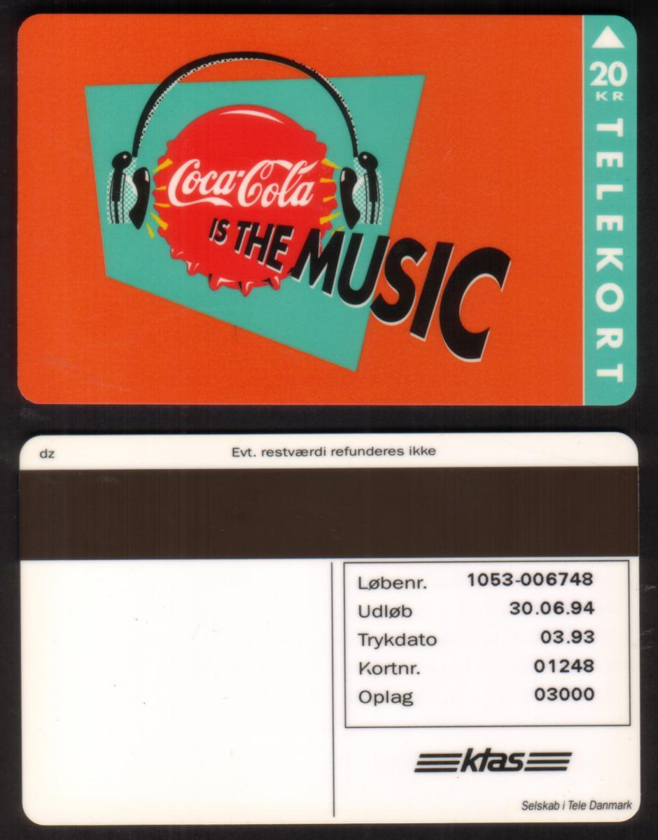 Overall, the card combines Coca-Cola’s classic imagery with music and modern design elements, reflecting both the brand’s heritage and its engagement with contemporary culture during the early 1990s. The size and layout conform to collectible phone card standards common in that era, making it a notable item for collectors of Coca-Cola memorabilia and phone cards from Denmark.