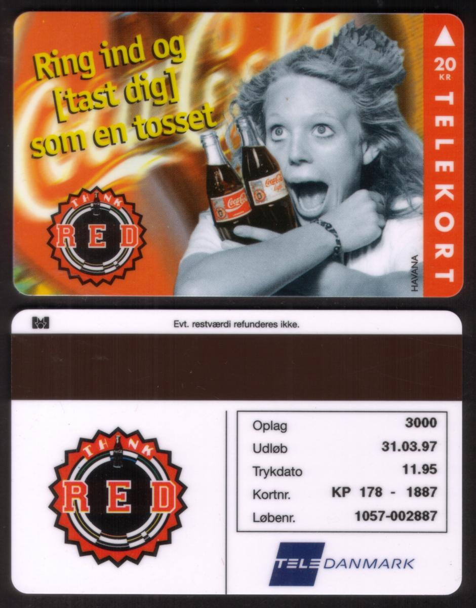 Multiple logos are visible on the card. The Teledanmark logo appears in the top right corner, signifying the telecommunications provider. The Coca-Cola logo is on the left side. The card has a clean, bold red-and-white color scheme, making the text and the vibrant photo easily noticeable and clear.