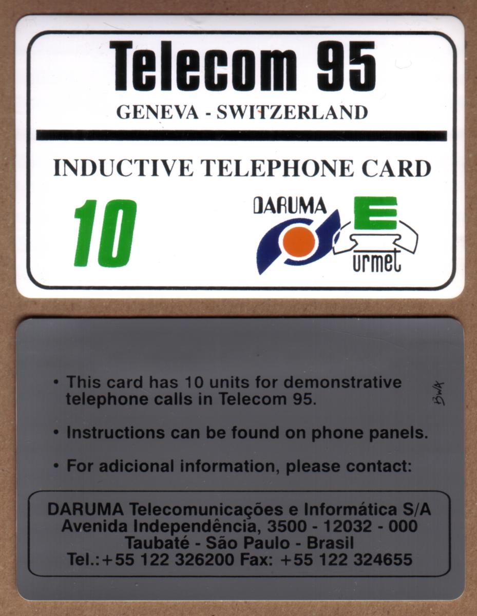 Produced in 1995, this Urmet Telecom stored value card is a representation of telecommunications history during that period, particularly related to the Geneva Telecom event. It exemplifies the type of magnetic prepaid telephone cards used for inductive telephone systems in Brazil, making it a notable piece for both phone card collectors and those interested in international telecom souvenirs.