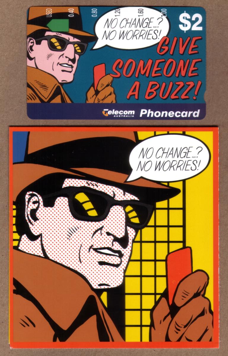 The top left corner features the text "NO CHANGE NO WORRIES," highlighting the ease or convenience associated with this card. Towards the bottom right side, the phrase "Give Someone A Buzz" appears in red, drawing attention and reinforcing the phone card’s purpose. The card is housed in a sealed folder, indicating it is preserved in mint condition for collectors or users. The design and wording suggest a promotional tone centered on hassle-free calling.