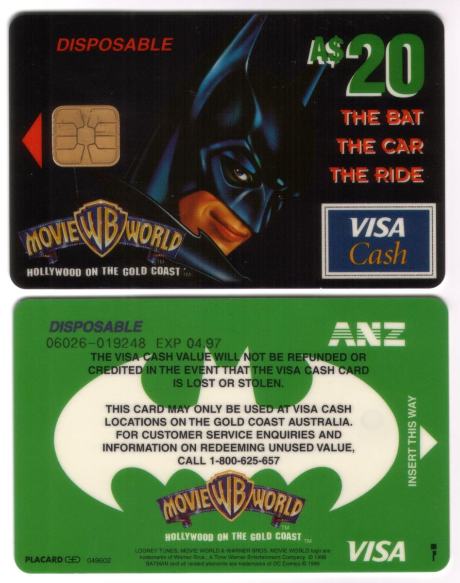 A limited edition Warner Bros Visa Cash card featuring Batman from the WB Movie World theme park on Australia''s Gold Coast, blending superhero appeal with financial innovation.