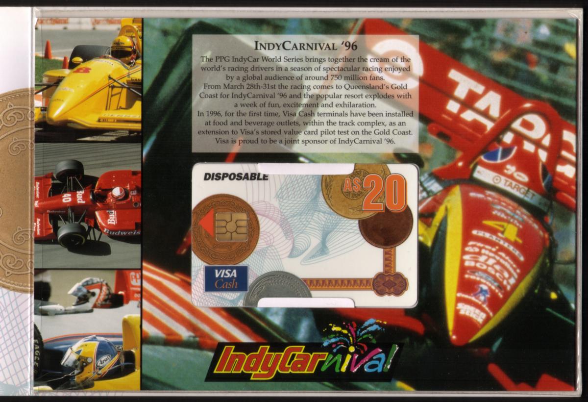 This collectible bank card is an Australian stored value Visa Cash Card issued by ANZ and the National Australia Bank, with connections also to Australian Credit Unions and Westpac. It is themed around the 1996 IndyCarnival and the PPG Indy Car World Series, highlighting auto racing. The card displays the text “INDYCARNIVAL ‘96” in bold letters across the left side, accompanied by a stylized image of a race car helmet and racing elements, primarily in shades of red and orange.