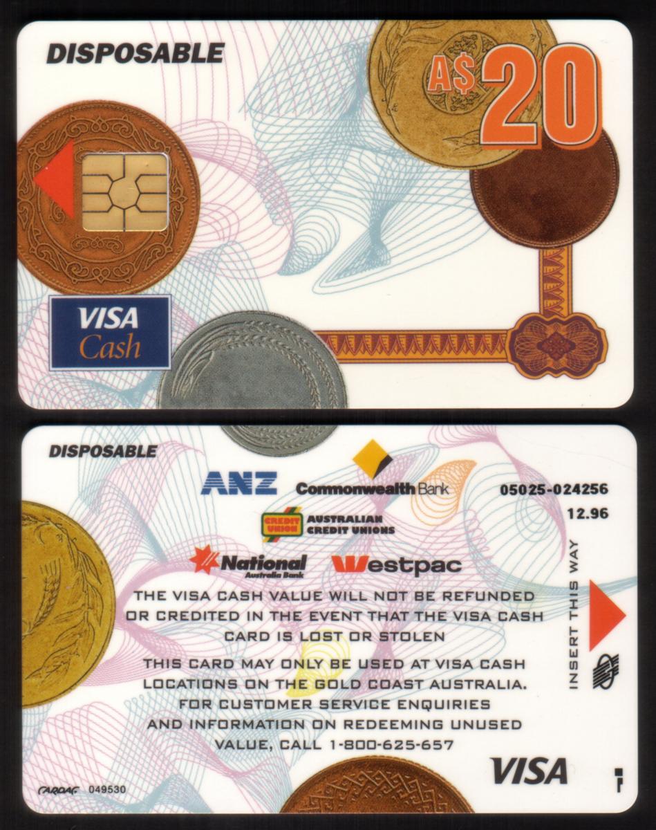 Visually, the card captures the energy of the 1996 auto racing event with dynamic graphics that focus on the helmet and racing imagery, presented cleanly with sharp lines and a modern design style consistent with mid-1990s promotional visuals. The value of $20 is indicated, reinforcing its function as a stored value Visa Cash bank card for use within Australia.