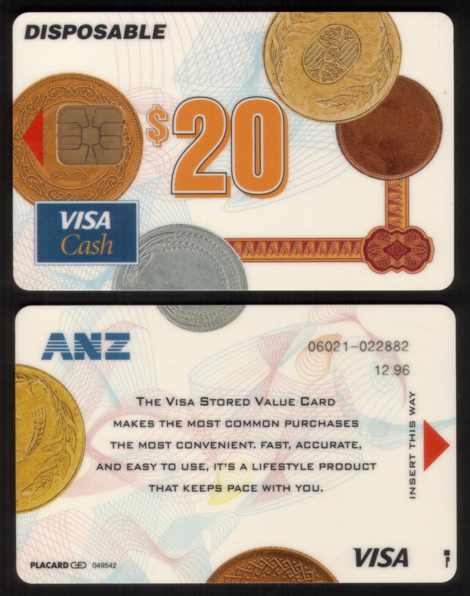 This collectible bank card is an Australian Visa Cash Card issued by ANZ Bank as part of a stored value trial, with an expiration date of December 1996. The card features a denomination of $20 and is designed with a blue gradient background. The front displays "VISA CASH AUSTRALIA ANZ BANK" prominently, along with the text "STORED VALUE TRIAL EXP 12/96," indicating its purpose as a trial for stored value banking technology.