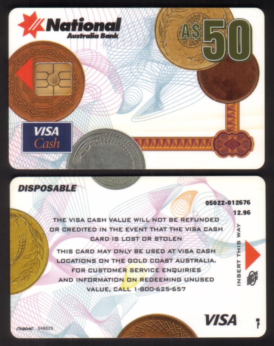 The card’s format and printed details confirm its use as a stored value bank card intended for convenient financial transactions in Australia during the mid-1990s. It is a tangible example of early Visa Cash technology employed by a major Australian banking institution.