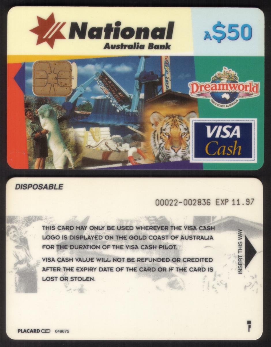 This collectible chip card is a Visa Cash Card issued by National Australia Bank, associated with Dreamworld theme park. It features the Dreamworld Conservation Park in Australia. The card has a value of $50 and was valid until November 1997.