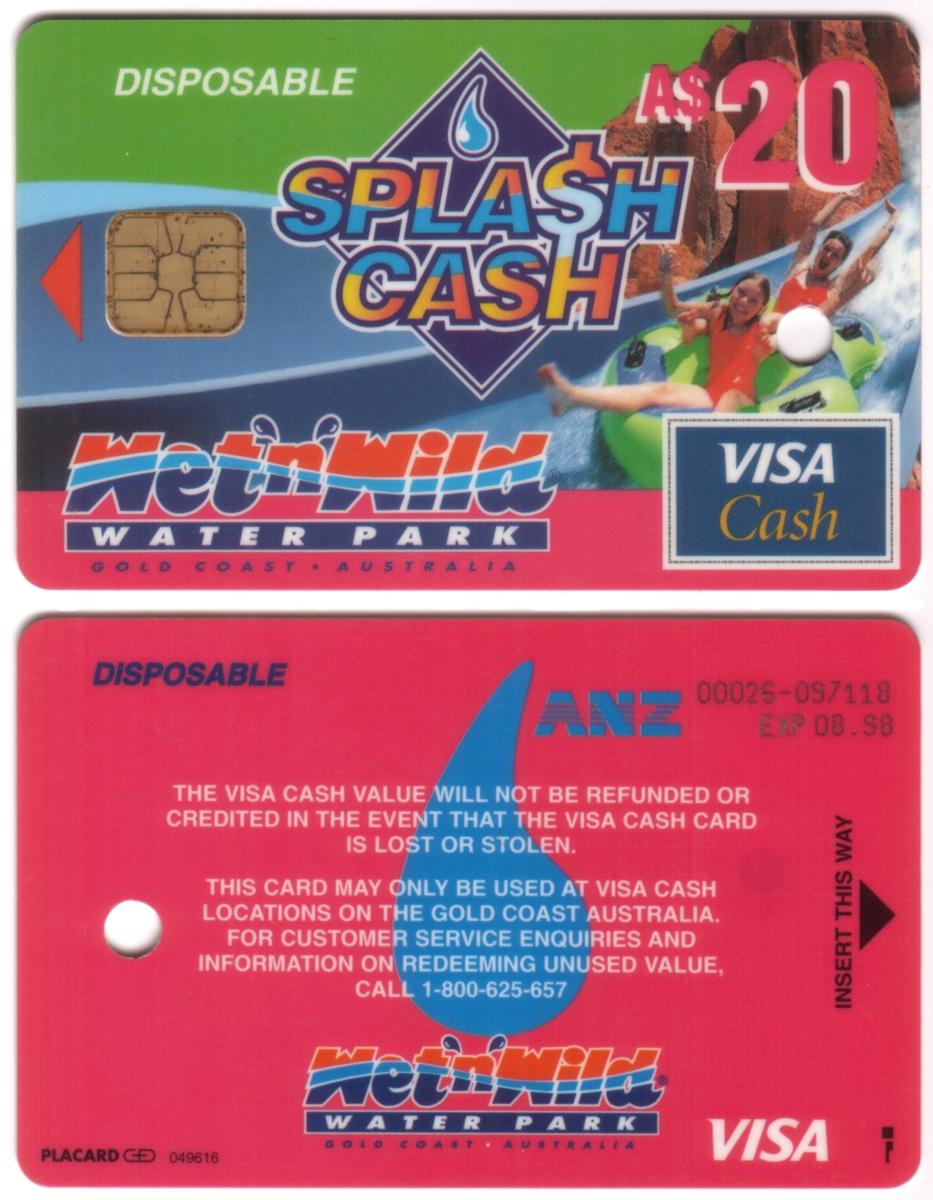 The card shows evidence of use indicated by a punched hole. Overall, it serves as a collectible Australian prepaid bank card tied to the Wet 'n' Wild Water Park experience on the Gold Coast, issued by ANZ and part of Visa’s Cash program in the late 1990s.