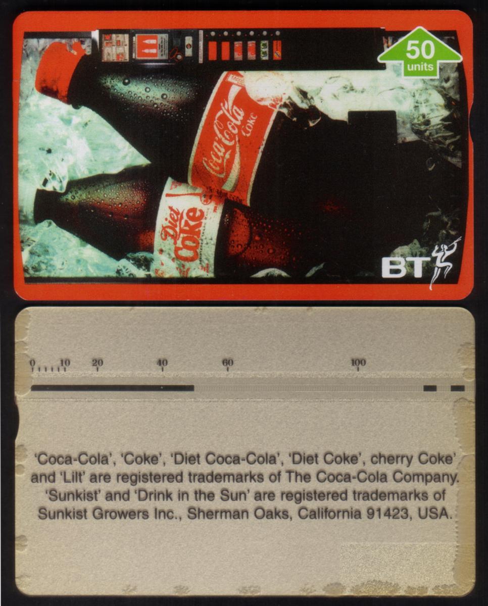 Prominently displayed at the top left is the Coca-Cola logo in red. The card’s design is clean with a focus on the realistic photographic depiction of the Coke bottles. This collectible phone card bears the BT (British Telecom) logo connected to Great Britain, denoting the telecommunications provider associated with its use. The overall presentation celebrates Coca-Cola products within a clear, cold, and crisp visual context.